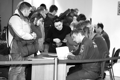 2月20日凌晨,在俄罗斯首都莫斯科的多莫杰多沃机场,工作人员为从叙利亚返回的俄罗斯人办理手续。俄紧急情况部两架运载人道主义救援物资的飞机19日抵达叙利亚,将99名俄罗斯和其他几个独联体国家的公民带回莫斯科。
