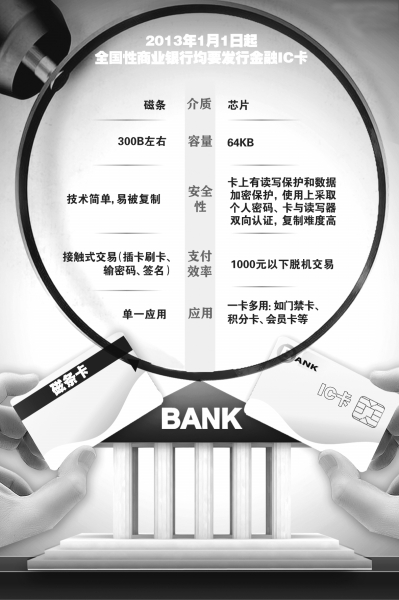 为让金融IC卡早日走进百姓生活,央行早在两年前就制定了“在全国范围内推进银行卡芯片迁移”的时间表:全国性商业银行布放的POS机、ATM机分别于2011年底、2012年底前完成改造;2013年起实现所有受理银行卡的联网通用终端都能受理IC卡。全国性商业银行自2013年1月1日起发行IC卡;在经济发达地区和重点合作行业领域,自2015年1月1日起实现IC卡全流通,磁条卡退出。专家认为,这不仅将是一场银行卡的革命,更将是中国人消费方式的重大调整。