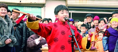 2月25日,来自山东潍坊、济宁、泰安、菏泽、肥城等地以及北京、天津、河北、辽宁、内蒙古等地的民间艺人纷纷赶到山东惠民,参加为期七天的曲艺盛会——胡集书会。据悉,胡集书会已有800余年的历史,与河南马街书会齐名,被誉为“民间曲艺的活化石”。图为山东泰安曲艺协会9岁的张俊杰在表演快板书。本报记者 刘新武摄