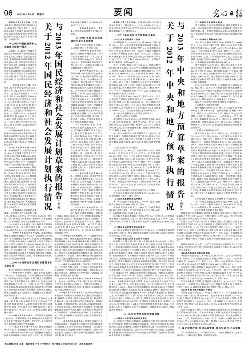 关于2012年中央和地方预算执行情况与2013年中央和地方预算草案的报告(摘要)