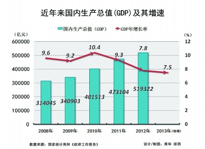 今年《政府工作报告》将2013年的中国经济增长预期目标定为7.5%左右,该目标水平与2012年的经济增长预期完全一致,这也是我国连续第二年将增速降低,先前这一指标曾连续7年设为8%左右。不过,从国际横向比较,这一增长水平仍然是较大经济体中最高的。