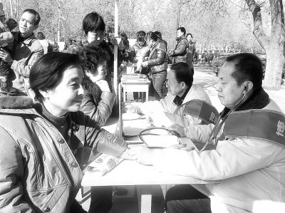 | 日前,山东省淄博市周村区的医务工作者为市民义务体检。 本报通讯员 孙德志、胡新广摄 |