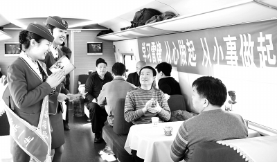| 3月5日,G71次列车乘务员向旅客宣传雷锋精神。 本报记者 杨慧峰摄 |