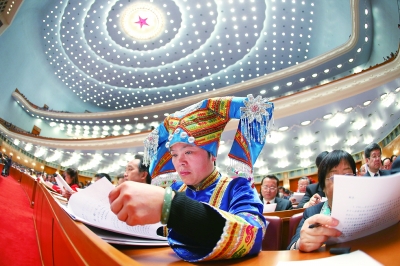 | 人大开幕会上,一位少数民族代表对照报告认真听会。新华社发 |