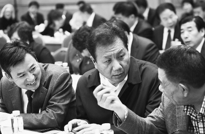 3月6日,出席第十二届全国人大一次会议的河北代表团召开小组会议审议政府工作报告,图为河北代表团代表在交换看法。