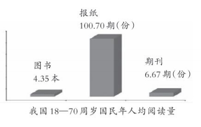 调查显示,我国18—70周岁国民年人均阅读图书4.35本,而报纸和期刊分别为100.70期(份)、6.67期(份)。来自中国新闻出版研究院组织实施的第九次全国国民阅读调查项目结果显示:国民阅读各种媒体的综合阅读率有所上升,其中,图书阅读率为53.9%。从国民对每天接触各类媒介的时长来看,传统纸质媒介和电波媒介的接触时长有所减少,新兴数字媒介的接触时长有所增加。