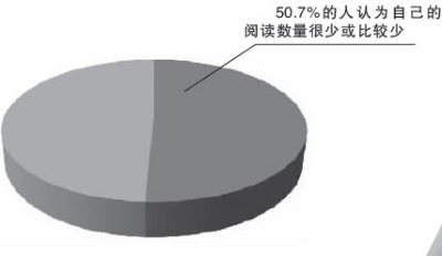 调查显示,我国国民对个人阅读数量评价中,只有1.2%的国民认为自己的阅读数量很多,7.6%的国民认为自己的阅读数量比较多,50.7%的国民认为自己的阅读数量很少或比较少,另有40.5%的国民认为自己的阅读量一般。62.6%的18—70周岁国民认为有关部门应当举办读书活动或读书节,其中,城市居民认为当地有关部门应该举办阅读活动的比例为60.6%,农村居民中这一比例为64.0%。