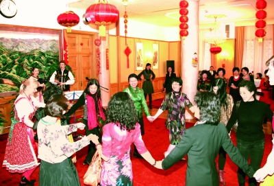 3月7日,中国驻捷使馆女外交官及外交官夫人、旅捷华侨华人妇女联合会和旅捷华侨妇女协会代表欢聚一堂,共庆“三八”国际妇女节。中国驻捷克大使于庆泰夫人孙丽萍向与会两国女同胞致以节日的祝贺和亲切问候,并鼓励她们为促进中捷友好交流发挥更大的作用。图为两国女同胞载歌载舞。