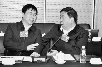 酒泉钢铁有限公司董事长冯杰代表(右)在小组讨论发言时表示,按照新的排放标准,在酒钢生产一吨钢,要比东部地区成本低100多元,从而使西部的钢铁、水泥等行业显现出地域优势。图为冯杰代表与兰州石化总经理李家民代表交谈。