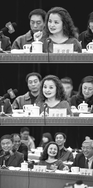 3月9日,在十二届全国人大一次会议北京代表团全体会议上,吴碧霞代表呼吁保护方言。她说,地方方言是文化的源泉和标志性的载体,没有地方方言这个语言交流平台,地方特色的文化品种就会消亡。为了让代表们更加形象地理解她的建议,吴碧霞当场演唱起了歌曲《说聊斋》,引来了会场的一片笑声。新华社记者 刘金海摄