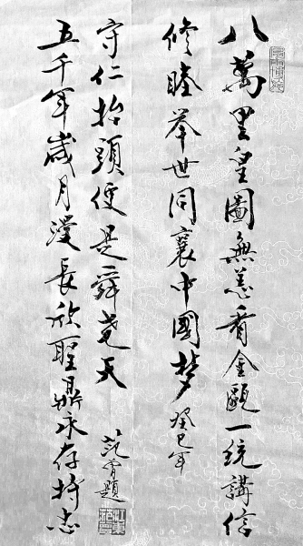 范曾于是去着了青衫,到案前铺纸、蘸墨、挥毫,不多时,一副“龙门对”已在纸上跃然而出:八万里皇图无恙,看金瓯一统,讲信修睦,举世同襄中国梦;五千年岁月漫长,欣圣鼎永存,持忠守仁,抬头便是舜尧天。书毕,范曾从印章盒里选出两枚印章,于上联文首处钤上一“风雨博施”引首章,于下联落款后钤上一“江东范曾”姓名章。钤完印章,范曾转首对旁观者说,此联,送你了!