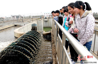 3月21日,河南省焦作市武陟县覃怀中学的学生走进污水处理厂,了解污水处理过程,以这种方式迎接3月22日“世界水日”的到来。联合国确定2013年“世界水日”的宣传主题是“水合作”。我国纪念2013年“世界水日”和“中国水周”活动的宣传主题为“节约保护水资源,大力建设生态文明”。秦林林摄/光明图片