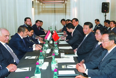 习近平表示,中方十分看重埃及作为阿拉伯、非洲、伊斯兰和发展中大国的地位和影响,珍视两国人民传统友谊。我们对埃及过渡进程取得的积极进展感到高兴,充分理解埃及目前面临的一些暂时性困难,中方愿继续向埃方提供力所能及的帮助。双方应该重点推进贸易、投资、人文等领域合作,搞好苏伊士经贸合作区项目。我们相信,埃及国家建设事业一定会取得新发展,中埃战略合作关系一定会取得新进展。