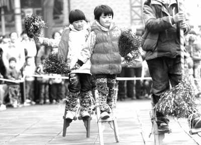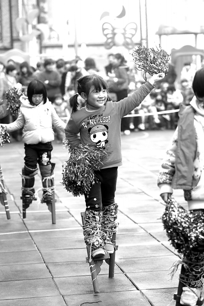 4月23日,来自北京平谷大华山幼儿园的幼儿在北京东城二幼春季运动会上向城里小朋友展示民间体育“走高跷”。东城二幼作为城区手拉手支教基地,充分发挥示范作用,使教育资源向郊区辐射,让城乡儿童相互学习,共同成长。本报记者 赵洪波摄