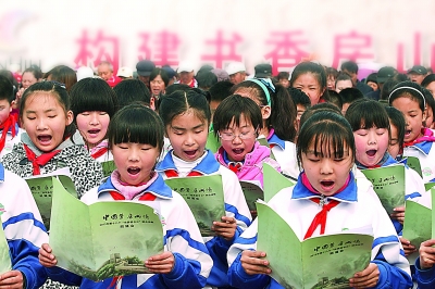 4月23日,以“中国梦·北京韵·房山情”为主题的2013年第十八个“世界读书日”群众诗歌朗诵会在北京理工大学良乡校区举行。朗诵会分为《艰难求索》、《东方神话》、《春之畅想》、《兴我家乡》四个篇章,参加朗诵人员达3000人。本报记者 程伟光摄