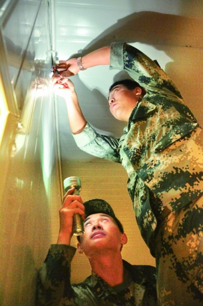 板房教室窄窄的屋檐下,几名战士正就着应急灯光连接线路。雨水顺着帽檐淌下,一抬头便会被灌一鼻子。板房教室内,几名战士一边打着手电接线路,一边和屋檐下的战友开玩笑:“你们淋饱了就喊,换我们出去淋一会儿。”