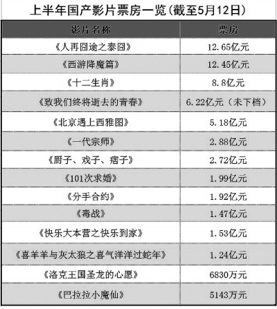 今年,仅第一季度,全国城市影院电影票房收入就超过52亿元,其中国产片36亿元,约占69%;共有11部影片票房过亿,其中6部是国产片,《西游降魔篇》以12.5亿元荣登榜首,其他五部影片分别是《一代宗师》《北京遇上西雅图》《101次求婚》《快乐大本营之快乐到家》《喜羊羊与灰太狼之喜气羊羊过蛇年》。