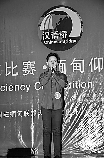 5月24日,“汉语桥”世界中文比赛缅甸仰光赛区决赛在中国驻缅甸大使馆文化处举行,11名选手进行了激烈角逐。近年来汉语的魅力和影响在缅甸逐渐扩大,学习汉语的人数明显增加。左图为一名参赛选手在比赛中用中文朗诵。(本报驻仰光记者 汤先营摄)