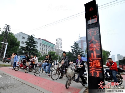 5月27日,在河北省邯郸市滏西岗,行人等待红灯。近日,河北省邯郸市交警部门在市招岗、光明岗、滏西岗等处安装了40个LED显示屏的立柱式一体化交通信号灯,此信号灯美观、醒目并带有语音提示,让过往的行人一目了然,警示行人不要出现“中国式过马路”。