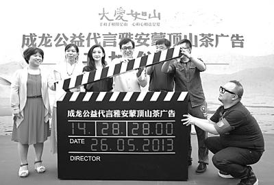 5月26日,由著名影星成龙代言的雅安蒙顶山茶公益广告片开拍。成龙表示,希望能增添地震灾区人们重建家园的信心,尽快自我完成造血功能,通过自己的努力让家乡变得更美好。本报记者 苏丽萍摄