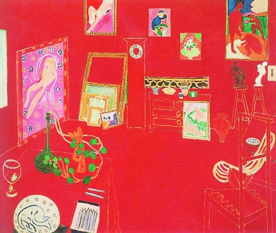 “现代艺术”,马蒂斯说,“通过它的颜色发散出一种愉悦,这使我们平静。”在这幅色彩绚丽的作品当中,他把画室——浸泡在红颜色里。艺术作品和装饰物品被勾画得很实在,而家具和建筑物却被处理成由线条构成的略图,由红色表面上的“空隙”勾勒出轮廓线。在那些空隙之间,显现出之前画上去的隐没在红色下面的一层层黄色和蓝色;马蒂斯不停地更换着颜色,直到自己认为满意为止。马蒂斯仔细安排了自己用来展示的作品,相交的斜线暗示着深度,窗户的蓝绿光线烘托出内部空间的感觉,而红色的延伸则使画面平展开来。