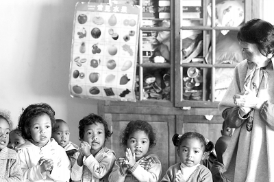 5月29日,在马达加斯加中南部山城菲亚纳兰楚阿,82岁的汉语老师陈淑英在华侨小学幼儿班上教孩子们汉语。陈淑英的父母上世纪早期从广东顺德漂洋过海来到马达加斯加谋生。陈淑英1931年出生于马达加斯加,她的先生1998年过世后,她便开始到华侨小学教孩子们汉语,到现在一共教过700多名学生。目前,陈淑英在华侨小学每周教学四天,大小班共50多个学生,教学内容为唱中文歌、用中文算数和简单的汉语书写。“我现在每天跟着中国来的志愿者学习。学汉语、教汉语是我最大的乐趣。只要我走得动,我就会坚持学汉语和教汉语。在我有限的生命里,我梦想做一个好老师,教会更多孩子说流利的普通话。”陈淑英说。 新华社发