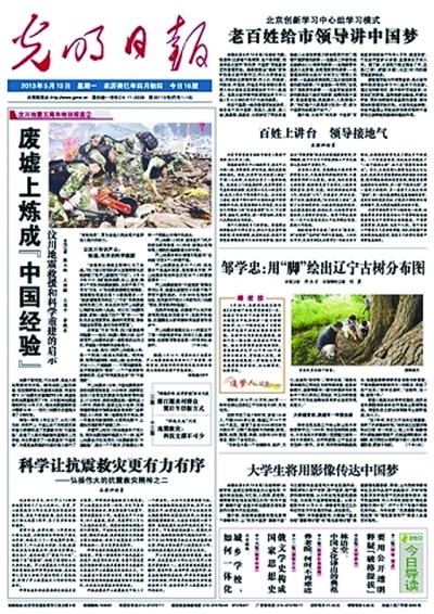 光明日报不仅报道今日汶川,还注重宣传普及抗震救灾、防震减灾科学知识。比如,中国地震局地质研究所研究员引导人们正确看待西南地区地震;从芦山地震看政府应急管理能力的进步;科学在抗震救灾中的合理利用;社会力量参与抗震救灾需要完善等等。