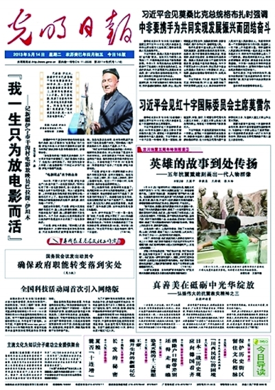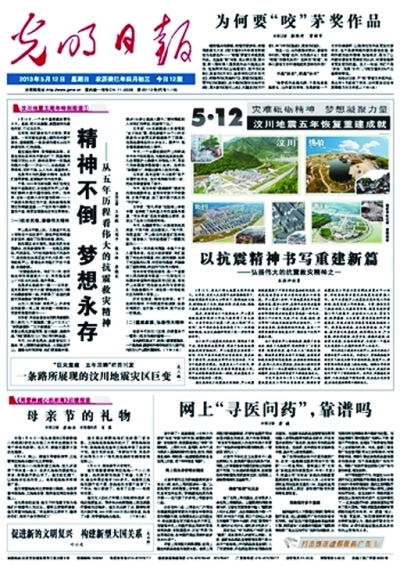 2013年5月12日,汶川地震五周年。《光明日报》适时推出“汶川地震五周年特别报道”,先后刊出三篇政论式通讯、五篇系列评论、两个专栏,辅以相关报道及新闻图片,弘扬抗震救灾精神,抒写追寻梦想乐章,立意高远,发掘深刻,积极传播社会主义建设正能量,尽显大报风范。