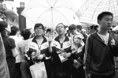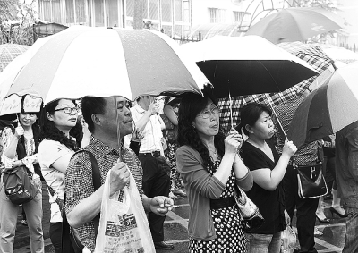 图为北京市第十一中学考点外,家长们在雨中等待孩子考场凯旋。本报记者 郭俊锋摄