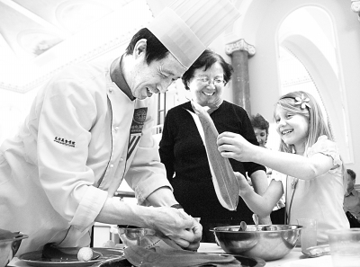 6月10日,在俄罗斯首都莫斯科,一名俄罗斯小朋友在中国厨师的指导下学包粽子。当天,莫斯科中国文化中心举行庆祝活动,邀请50余位中俄各界友人齐聚一堂,共迎端午佳节。新华社发