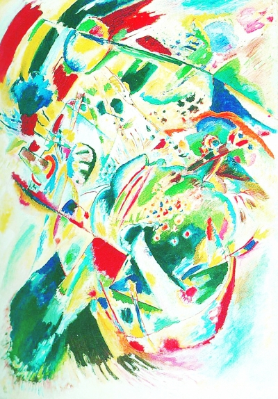 这件作品创作于1914年,由四幅色彩浓重而亮丽的绘画组成的系列作品当中的一幅,那一时期,好几个国家的艺术家都已经开始对抽象艺术的先行者康定斯基所提出的“非客观”绘画进行了探索,这种绘画所展现的是一些不能立即被识别出来的事物。康定斯基渴望自己的每一件作品都是“对一种情绪的图画式的描述”。对其中一幅画的研究表明,当他在构思这幅画的时候,头脑中有一幅风景,虽然在所有这四幅作品当中,也许我们依然能够分辨出一片田地、一座山峰或是一朵云彩,但是它们都经过了极大的变形处理。类似的情况还有一些,如果确实像一位学者所猜测的那样——这些作品表现了四个不同的季节,那么它们的颜色和抽象化的造型则是艺术家在一年当中对各个阶段的不同感受(而不是任何具体的景象)的反映。