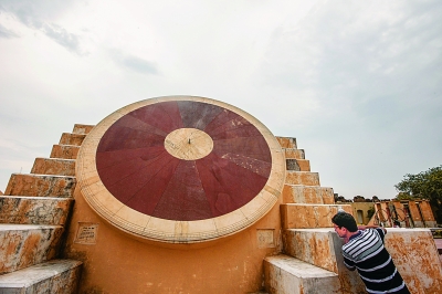 6月14日,一名参观者在印度拉贾斯坦邦首府斋浦尔的简塔·曼塔尔古天文台观看日晷。 印度斋浦尔的简塔·曼塔尔古天文台建成于18世纪初,建筑为砖石结构。天文台内建有一组由20多个主要固定装置构成的观测设备。它们是已知观测装置中的不朽杰作,其中各种观测仪器目前还能为天文学家所用,许多器物还被用于研究占星学。简塔·曼塔尔古天文台为用肉眼进行天文观测而设计,其建筑和装置都采用了不少创新设计。它是印度最重要、最全面、保存也最完好的古天文台,展现了印度莫卧儿时代末期对宇宙的认知以及探究天文学的能力。2010年,斋浦尔的简塔·曼塔尔古天文台被联合国教科文组织列为世界遗产。 新华社发