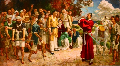 田横是齐国的后裔,汉高祖一统天下后,派人前来招降,田横让人取自己的头颅去见前来招降的汉高祖,这样既免去受降的屈辱,又保全了五百名士兵的性命。这幅油画描绘的就是田横与五百壮士诀别的场景。