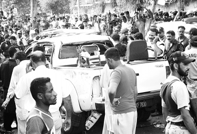 7月10日,在巴基斯坦卡拉奇,人群聚拢在爆炸现场一辆被摧毁的皮卡车周围。当日,巴南部港口城市卡拉奇发生自杀式爆炸袭击,造成4人死亡、12人受伤。死者包括巴总统的首席安全长官比拉尔·谢赫哈。 新华社发