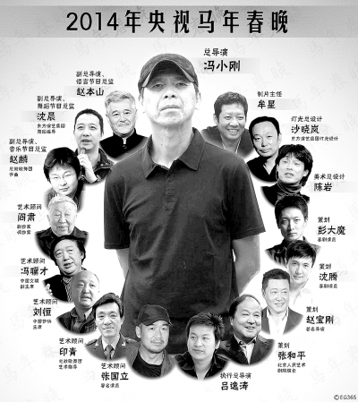 与往届春晚不同的是,2014年央视春晚网罗大量社会人才,汇聚全社会最优质的资源,组成团队为春晚支招、献计。其中艺术顾问团队由阎肃(剧作家、词作家)、冯骥才(中国文联副主席)、刘恒(北京作协主席)、印青(总政歌舞团艺术指导)、张国立(著名演员)组成。策划团队由张和平(北京人民艺术剧院院长)、赵宝刚(著名导演)、沈腾(喜剧演员)、彭大魔(喜剧导演)组成。创作团队为:总导演冯小刚,副总导演、语言节目总监赵本山,副总导演、舞蹈节目总监沈晨(东方演艺集团舞蹈编导),副总导演、音乐节目总监赵麟(总政歌舞团作曲),执行总导演吕逸涛,美术总设计陈岩,灯光总设计沙晓岚(东方演艺集团灯光设计),制片主任牟星。