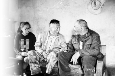 云南省迪庆州香格里拉县建塘镇红坡村的党总支书记殷云穗(左)和前任党总支书记肖知史在看望拉吉老人(右)。 新华社记者 张可任摄