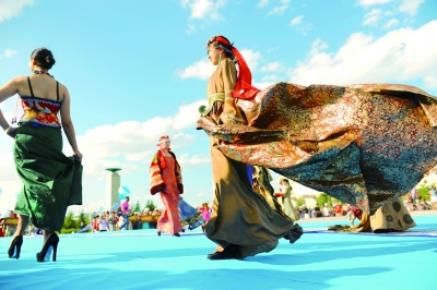 8月8日,来自锡林浩特市的代表队在展示服饰。当日下午,中国蒙古族服装服饰邀请赛在内蒙古自治区锡林浩特市锡林郭勒文化园广场开幕。模特展示蒙古族传统服饰89套、蒙古族现代服饰130余套、蒙古族行业服饰40余套。 新华社记者 金宇摄