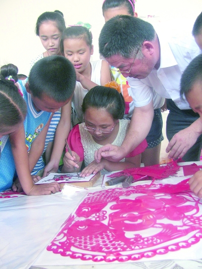 山东无棣荣德堂文化创意产业园有限公司的剪纸艺术大师赵玉华,近日来到无棣县埕口镇牛中村,为这里的留守儿童展示剪纸作品,并指导孩子们切实感受剪纸艺术的魅力。 蒋惠庆 丁宝冬摄