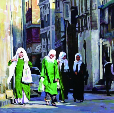 回国后,我以萨那老城为题材创作的绘画作品中,《老城的清晨》描绘了在晨光照射下,一群女学生身着绿色的长袍,头裹白色的围巾,从街巷深处走来。绘画中,学生们欢快、青春的笑脸总是浮现于脑海。我用宽阔的笔触,明亮的色彩,把萨那老城留在心中的那份难忘与美好,尽情在画布上展现。