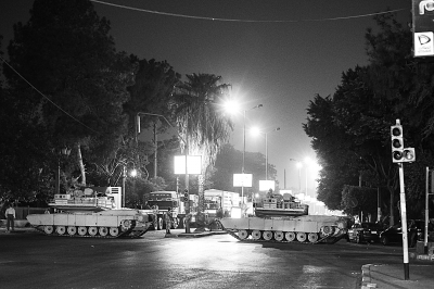 8月14日,在埃及首都开罗,两辆坦克在宵禁期间封锁街道。据埃及当地媒体称,埃及从当天下午16时开始进入紧急状态,为期一个月。在实行紧急状态的一个月中,或直至新通知下达前,每日19时至次日清晨6时在发生骚乱的开罗、吉萨、亚历山大等12个省份实行宵禁,在宵禁期间出行将可能被逮捕。 新华社发