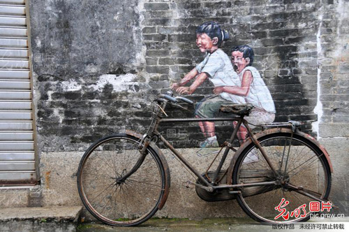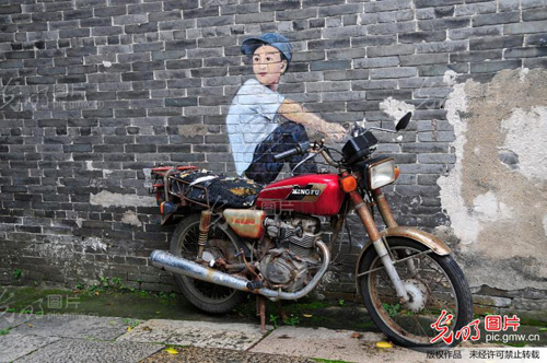 墙上是栩栩如生的孩童形象,而在墙的下面却是由废旧摩托车、自行车等组成的实物作为前景。这种巧妙的安排仿佛使人回到了上个世纪七八十年代的童年。(高殿华摄/光明图片)
