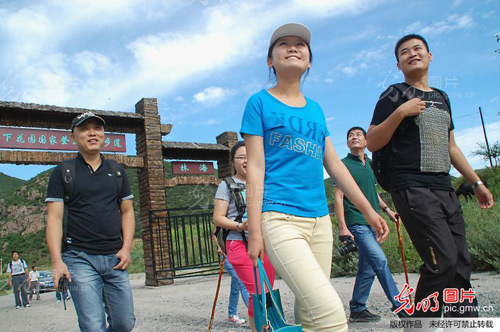 8月25日,来自北京的户外爱好者在下花园登山健身步道。河北省张家口市下花园区有保存完好的3万亩天然次生森林,于2011年建成华北地区第一条、全国第五条国家级登山健身步道,总长33公里。尹辉摄 光明图片