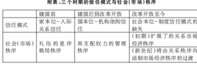 回到理论,“信任模式与社会秩序”之关联(见附表),在展现当下信任缺失现状的同时也揭示了它的真正历史原因:一是目前的中国社会的信任危机实质是普遍主义取向的社会本位-制度信任模式的缺失;二是改革开放以来,中国社会出现的“扩展了的关系市场经济秩序”说到底是传统“家本位-关系信任”与“国本位-再分配权力关系”的延续及其叠加效应,是制度信任空缺所导致的秩序替代品。三是深埋在中国人心灵深处的特殊主义取向的家本位-关系信任模式、国本位-机构依附信任模式,作为一种本土的文化结构力量抵制或挤压了顺应市场经济发展的富有普遍主义价值取向的社会本位-制度信任模式。