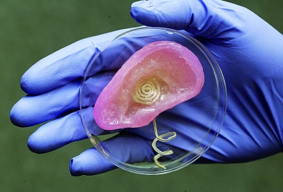 研究人员使用先进的3D打印技术制造了这种仿生耳,其中内置助听器。这类似于科幻电影《终结者》中的机械人,结合了活细胞和电子电路。普林斯顿大学机械和航天工程系副教授迈克尔-麦克阿尔卑恩是研究小组负责人,他说:“这是界面电子材料和生物材料的机械和热学技术挑战,我们目前研究一种新的方案,以电子协同方式建造和生长生物体,形成一种3D交织结构。”