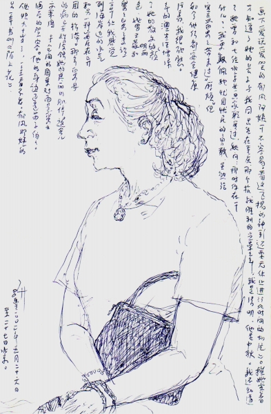 一顿饭到了或“光盘”或打包的阶段,郁风阿姨当仁不让地阻止了我舅舅付账,迅速地打开始终搂在怀里的那只皮包:“五百吗,不贵不贵!”在众人笑声中她把钱交到服务员手里。我目睹这一切,顿生画欲,“乘人不备”也迅速地掏出本子作画。如此近距离啊,这位年近九十的老太太,正挑着蛾眉,神采飞扬。我眼尖,注意到一只浅色发卡将她蓬松微卷的银发挽起,丝质短袖衬衣是孔雀绿的,与耳环项链和手镯极搭。画像很快画完,当场有十双眼睛盯着我,我握笔的手心都出了汗,更来不及涂色了。