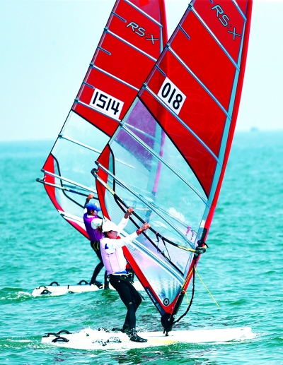 9月7日,帆船帆板决出了四个项目金牌,其中在女子RS:X项目中,广东队21岁小将郑曼佳赢得冠军。辽宁队孙佳莉和广东队陈佩娜分获二、三名。图为辽宁选手郝秀梅(白衣)和广东选手郑曼佳在帆板女子RS:X级奖牌轮比赛中,其中郝秀梅是此前被马娇救起的选手。本报记者 陈茵摄