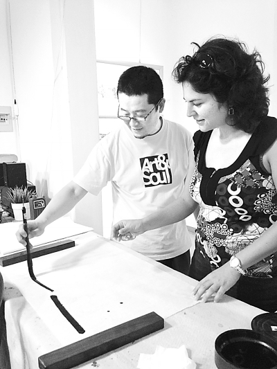 徐航是具有代表性的中国青年水墨艺术家,他的水墨作品不拘泥于物象,线条高简生动,挺拔古趣,造型简洁质朴,笔墨纵横雄健。他坚持传统中国水墨画的优势,同时吸取西方绘画的有益因素,大胆在水墨中融入绚丽的色彩。来自法国的青年女画家琳达师从法国著名画家奥利维耶-瓦勒。她的艺术灵感部分来自旅行,别样的生活空间滋养了她的想象力。而她敏感的创作力则来源于她对音乐和其他艺术形式的热爱。她的作品均采用丙烯绘画材料。图为两国艺术家们在交流切磋绘画艺术。