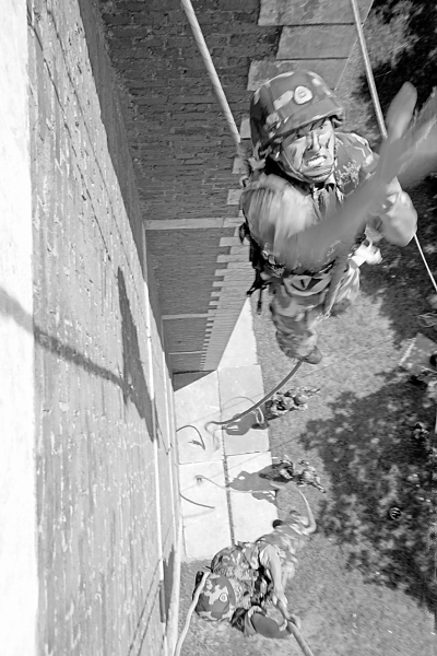 武警芜湖支队反恐分队队员苦练精兵,他们在12米的高楼上飞檐走壁,练习快速出动、急速攀爬、穿越障碍、围歼搜索等课目,努力提高快速反应和处置突发事件的能力。戚良鹏摄