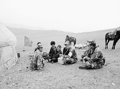党的群众路线教育实践活动开展以来,武警新疆边防总队哈密边防支队前山边防派出所结合单位辖区实际,及时组织党员官兵成立“马背服务队”,深入辖区偏远放牧点开展送温暖活动。图为“马背服务队”官兵为牧民群众进行常规体检。本报通讯员 董金明摄