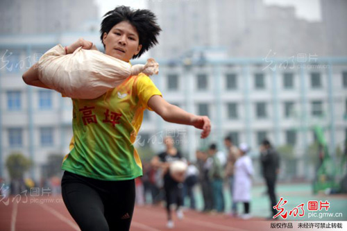 10月29日,在四川省南充市营山县第二中学,参加南充市第二届农民运动会的选手在参加负重100米跑比赛。来自南充9县市区的9支农民代表队600多名选手参加了10个趣味竞赛项目。李向雨摄/光明图片